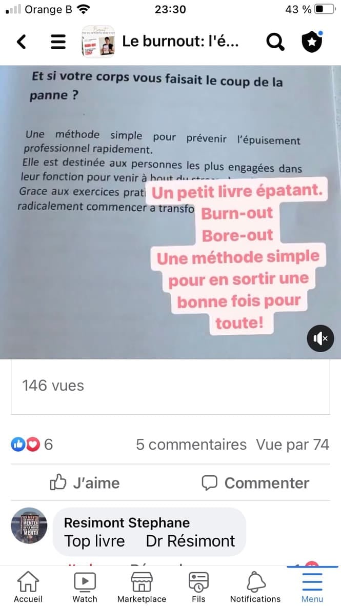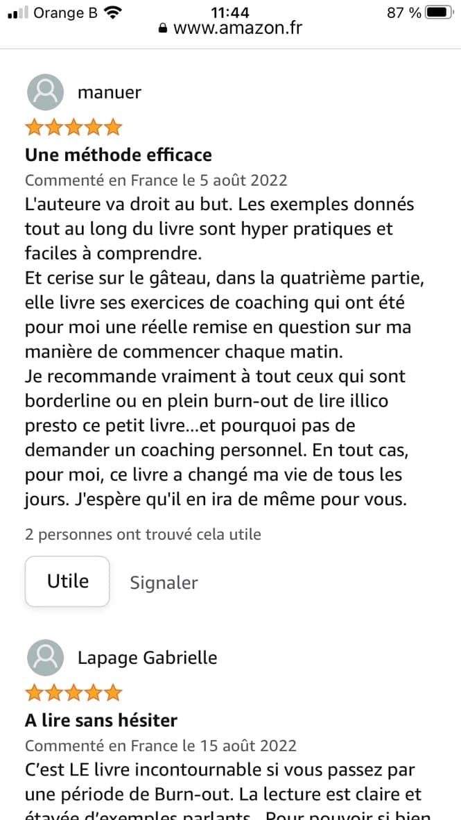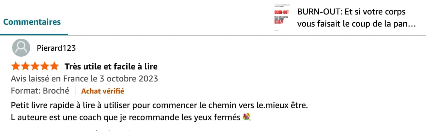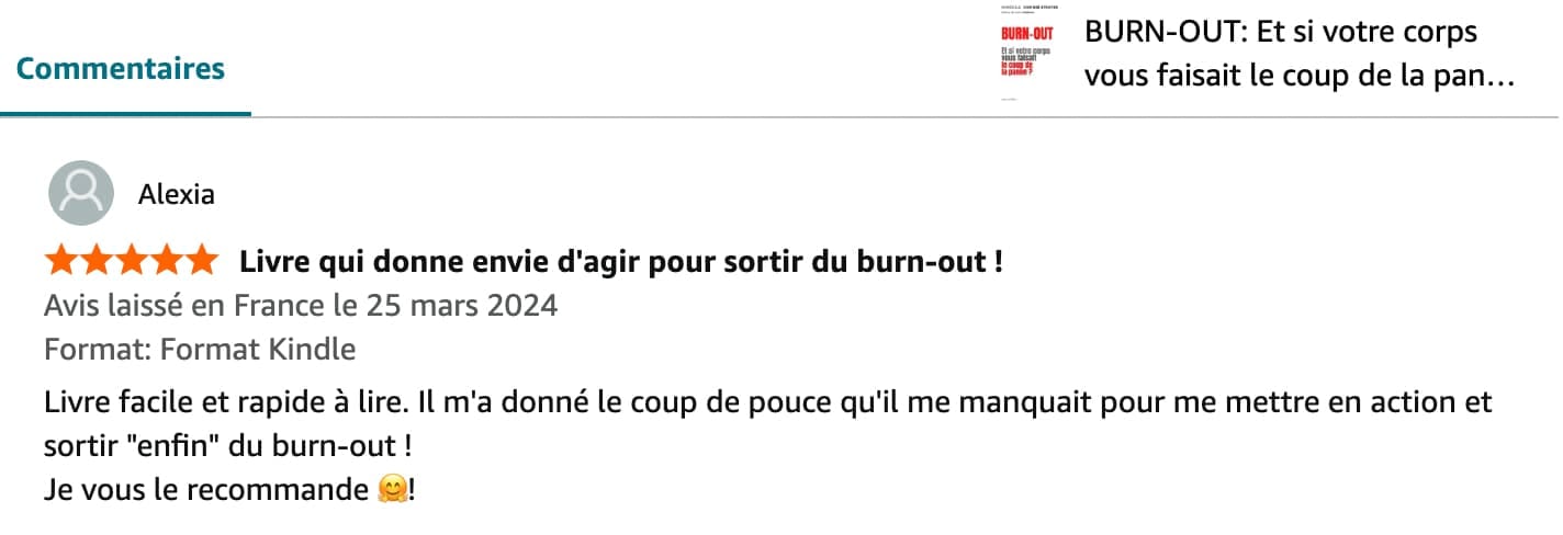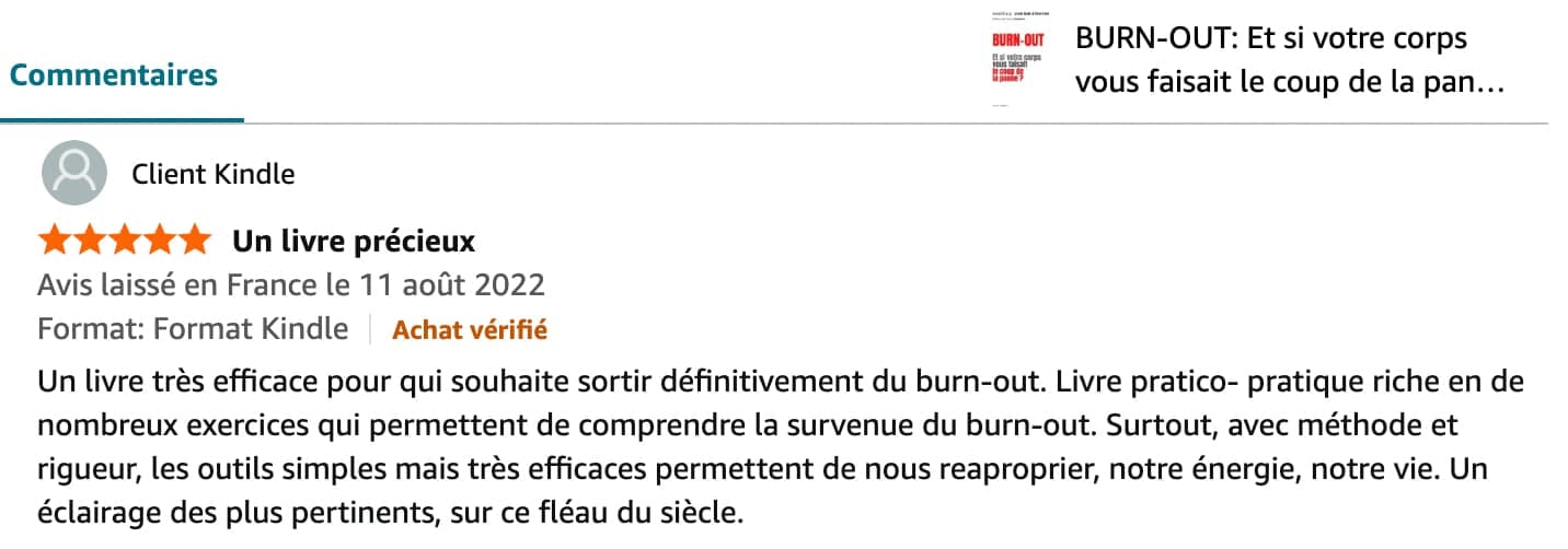 En quelques heures, l’auteure éclaire littéralement votre chemin. Que vous vous approchiez dangereusement du burn-out ou que vous vous y noyez, ici vous recevez vraiment des pistes, de réels conseils pratiques, des exercices concrets pour sortir du burn-out sans rechute. Tout cela va véritablement changer votre comportement et votre perception de la vie.