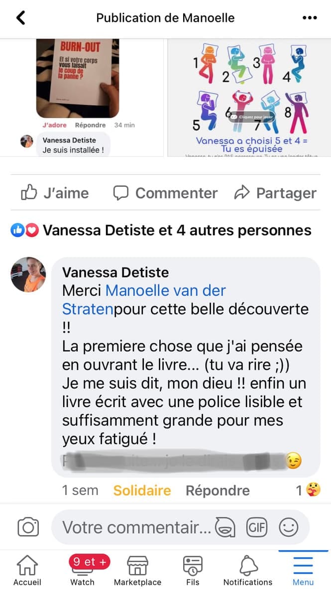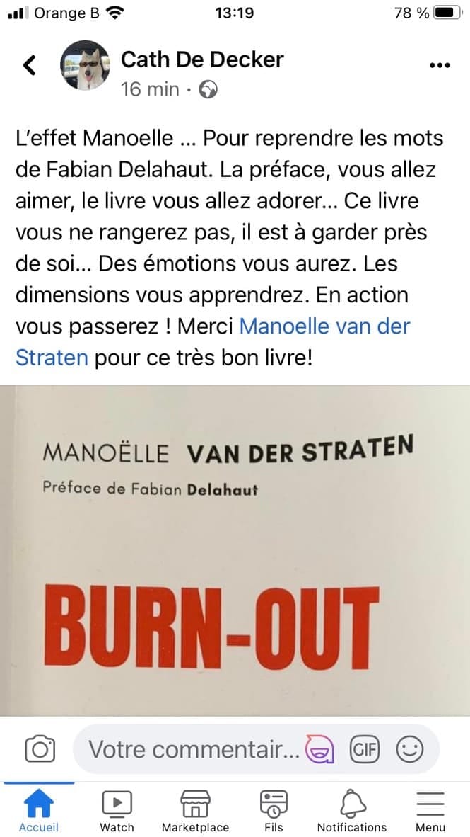 Toute ma famille bénéficie de ma transformation post burnout. J'ai retrouvé mon enthousiasme et ai relâché la pression due au travail. Je me respecte plus et sais comment profiter pour recharger mon énergie. Mon esprit est entraîné à repérer le positif ! Et les synchronicités sont là.
